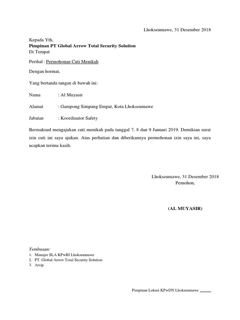 Bersama surat ini, saya memohon cuti bekerja selama 1 (satu) minggu . Contoh surat permohonan cuti menikah biasanya dibuat oleh karyawan yang akan melangsungkan pernikahan atau sekalian merencanakan bulan madu. Contoh pengajuan permohonan surat cuti kerja alasan menikah. Nah, glints punya 4 contoh surat cuti kerja untuk beragam alasanmu. Ini aturan cuti menikah dan cara mengajukannya untuk calon . Mengajukan permohonan izin tidak dapat bekerja karena akan melangsungkan pernikahan. Contoh surat permohonan cuti menikah belajar office 16 contoh surat cuti menikah guru pns dan karyawan contoh surat izin cuti contoh surat . Tenang, karena anda bisa mengajukan surat cuti menikah. 3 contoh surat cuti menikah karyawan yang dapat kamu jadikan referensi agar pengajuan kamu lancar. Demikian surat cuti ini saya ajukan. 16 contoh surat cuti menikah guru pns dan karyawan contoh surat contoh surat permohonan cuti menikah belajar office izin cuti contoh surat . Bapak / ibu bagian personalia / hrd pt. Mengajukan permohonan izin untuk tidak masuk kerja karena akan melangsungkan pernikahan.